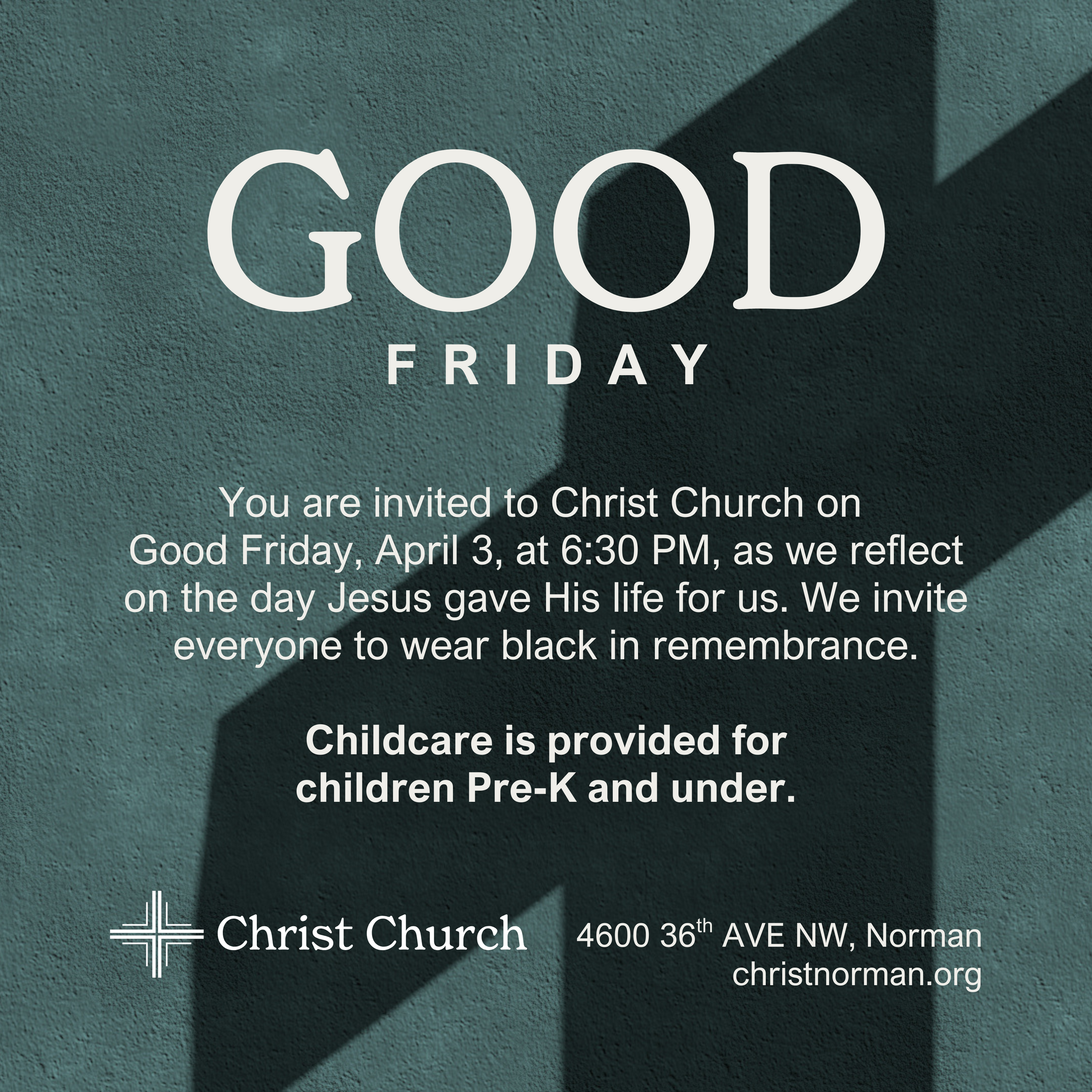 Hey! I don’t know if you’ve heard, but Christ Church in Norman is having a Good Friday service on April 3rd at 6:30 PM. It should be over by 7:30 PM. I went last year and really appreciated the quiet, somber, and reflective way we remembered the day Jesus gave His life for us. Would you like to go with me?